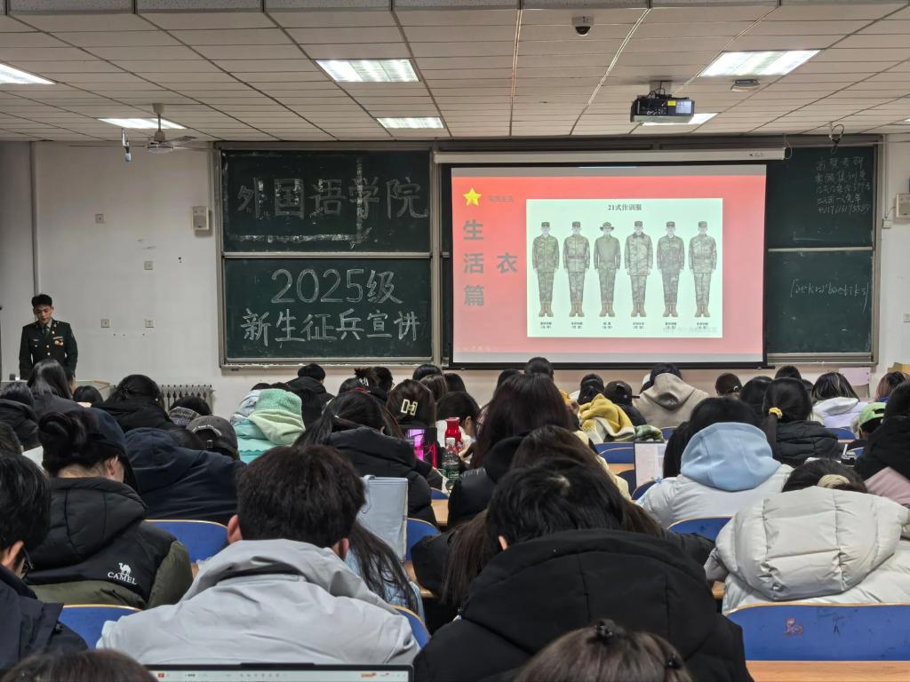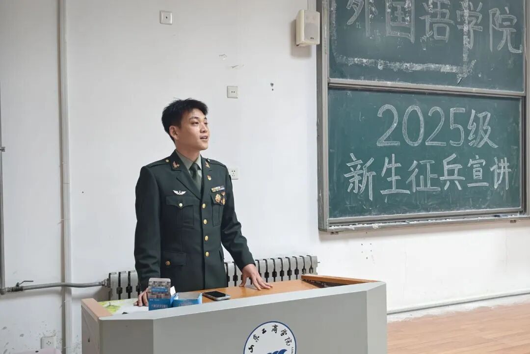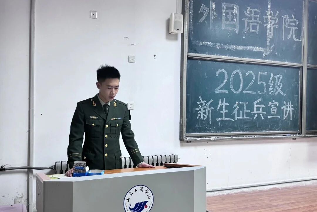 11月19日19:00,外国语学院于逸夫楼2109教室开展2025级新生征兵宣讲活动。山东工商学院征兵宣讲团退伍学生代表及外国语学院2025级全体新生参加。