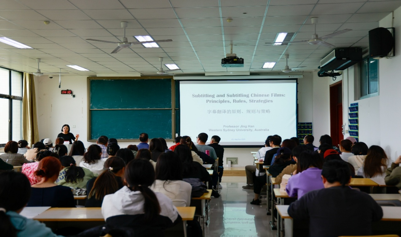 随后,韩静教授在逸夫楼3522为全院师生带来题为 “Subtitling and Subtitling Chinese films: Principles, Rules and Strategies”的精彩讲座。她从字幕翻译的“时空枷锁”讲起,通过对比分析不同译本,现场演示了如何在异语文化中精准“重建笑点”与“传递深意”。韩教授生动地指出:“字幕翻译不是简单的文字搬家,而是在有限的时空里,为观众重建一个完整的文化现场。”讲座尾声,外国语学院院长崔洪海教授代表学院,为韩静教授颁发了名誉教授证书,标志着双方长期合作关系的正式建立。